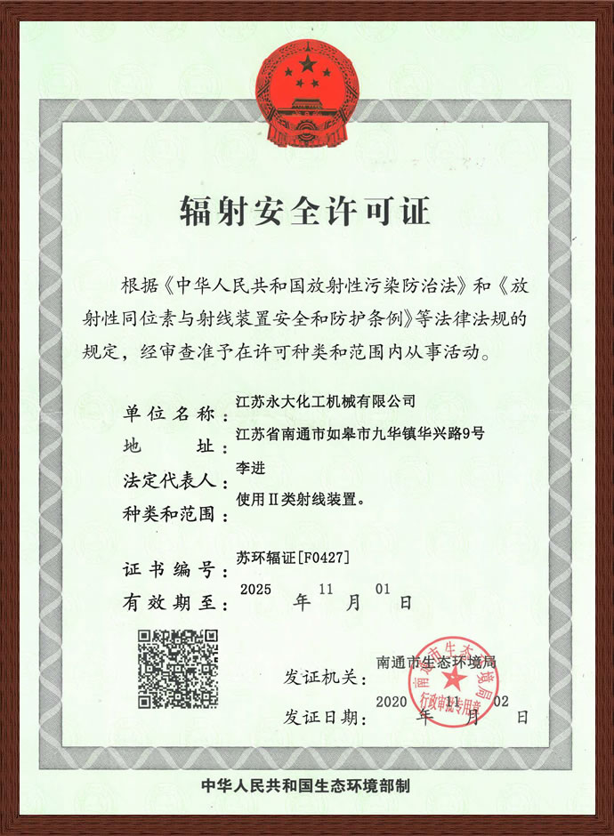 辐射安全许可证 - 资质荣誉 - 江苏PA直营化工机械股份有限公司