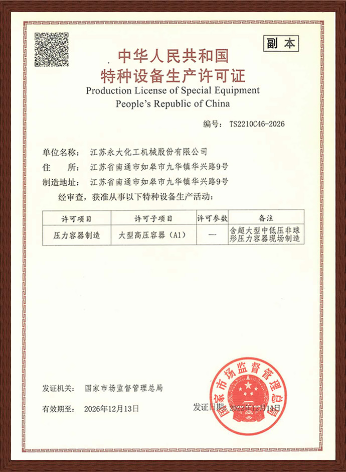 制造许可证正本 - 资质荣誉 - 江苏PA直营化工机械股份有限公司