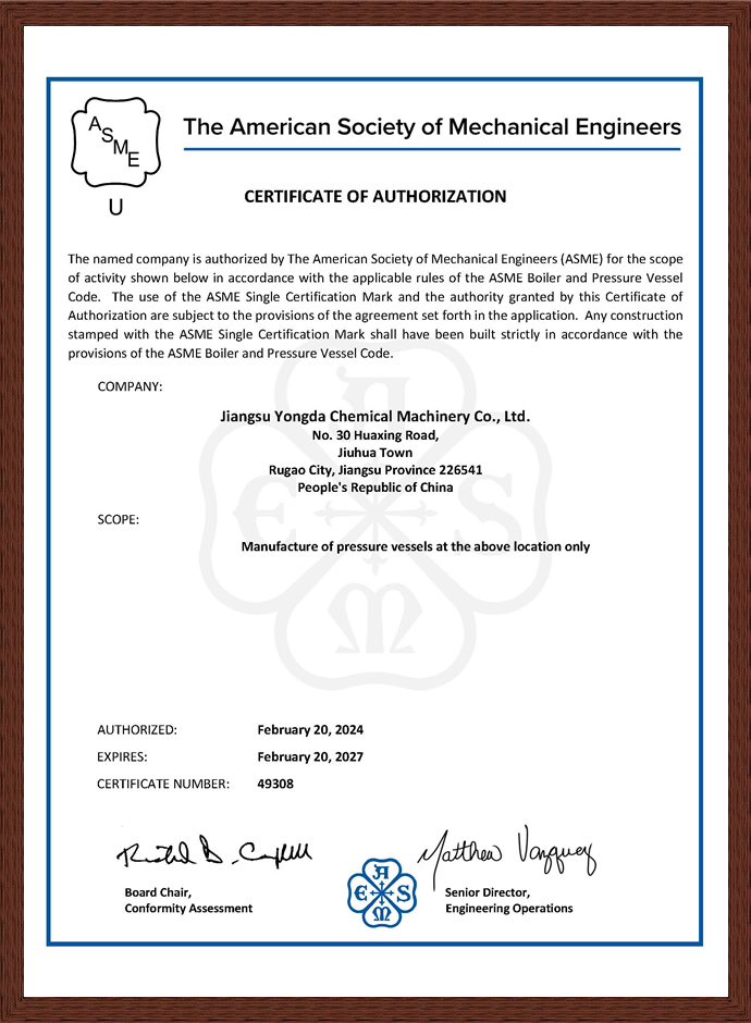ASME - 资质荣誉 - 江苏PA直营化工机械股份有限公司