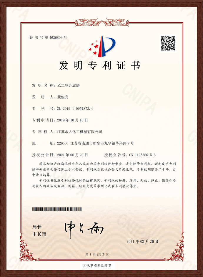 乙二醇合成塔发明专利 - 专利认证 - 江苏PA直营化工机械股份有限公司