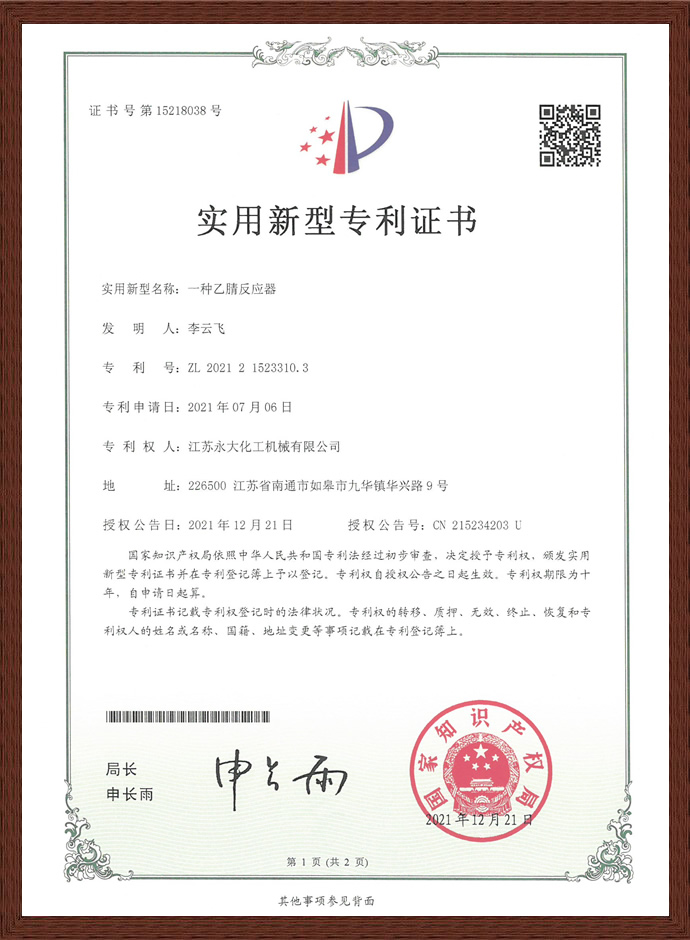 一种乙腈反应器 - 专利认证 - 江苏PA直营化工机械股份有限公司